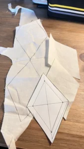 Je commence à tracer la veste et à travailler un pattern de losanges assemblés un par un. Le potentiel est là.