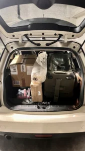 Fond 3M qui dépasse de partout, pieds lumière, accessoires, table à repasser, vêtements… tout y passe. Je me dis qu’en cas de réussite du projet, un utilitaire type Partner ou Kangoo sera un achat immédiat.